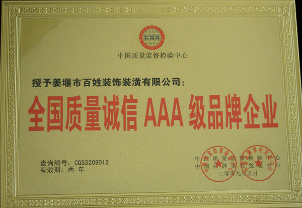 热烈祝贺百姓装饰装潢有限公司被评为“全国质量诚信AAA级品牌企业”!