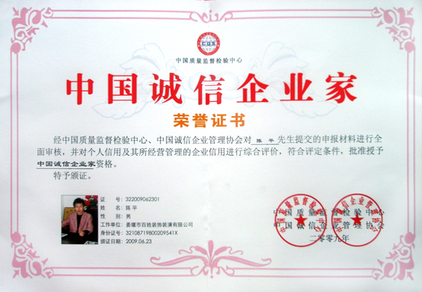 热烈祝贺百姓装饰总经理陈平先生荣获“中国诚信企业家”荣誉称号